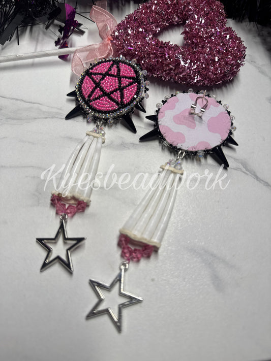 Pink Pentagon Beaded Earrings With Dentalium Drops