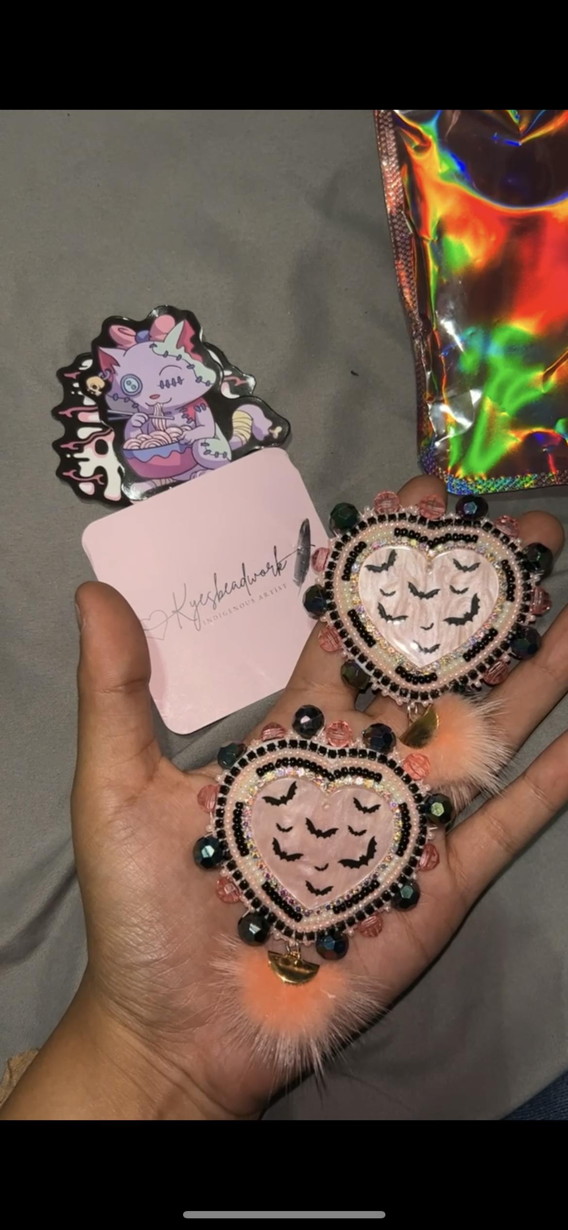 materials: miyuki seed beads in size 11/0, and 2mm rhinestone banding in black and rainbow silver. Backed with a bat backing and finger nail posts. Real mink fur tuffs dyed pink.