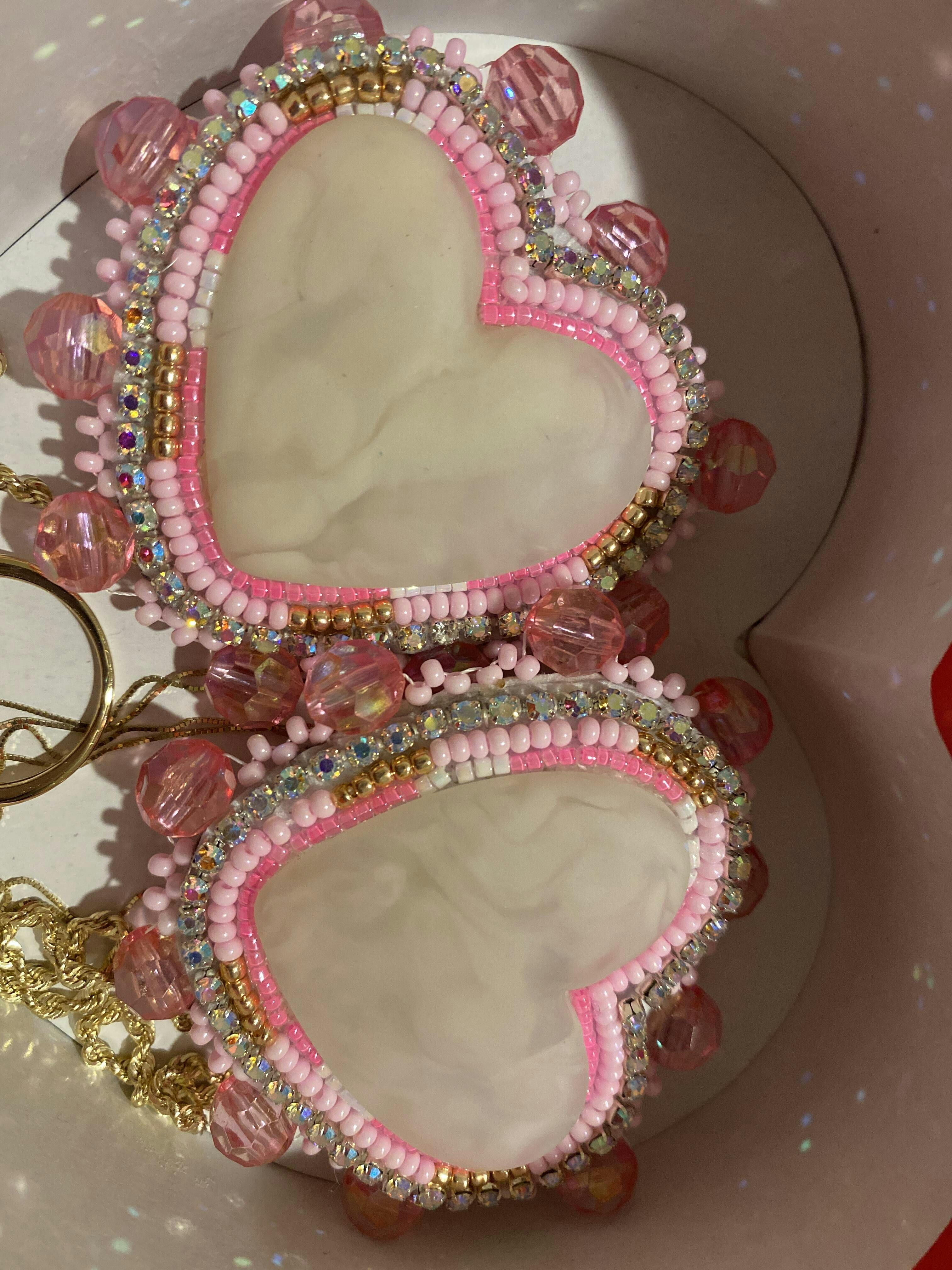 Pink heart handmade earrings; made with one row of delicas beautiful rinestone banding and dead beads edged with big and small beautiful beads!