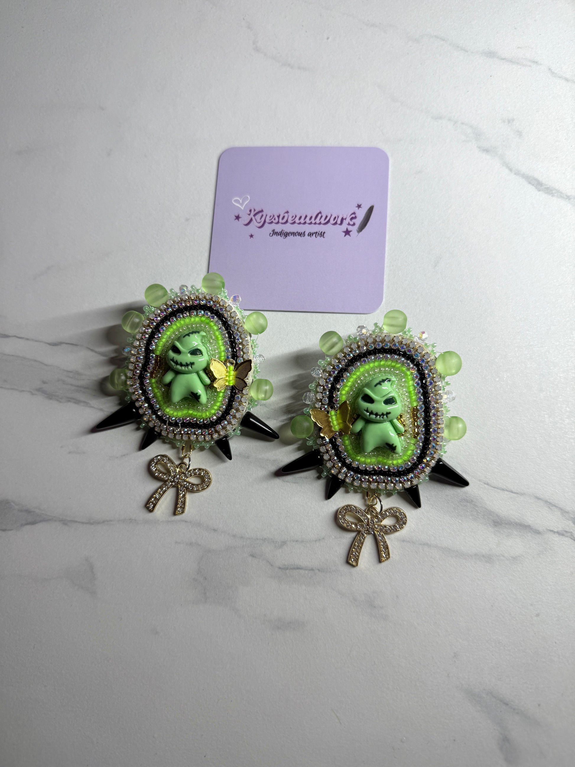 Handmade! One of a kind by yours truly. Oogie boogie beaded earrings with gold bow charms! 👻₊˚⊹ᰔ